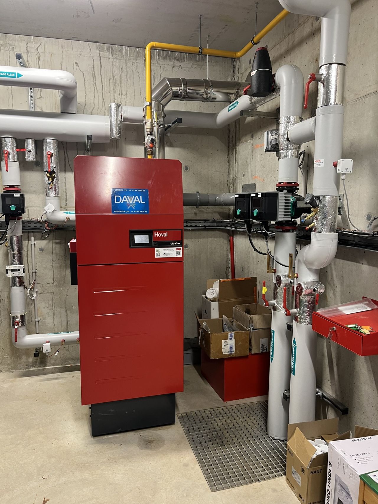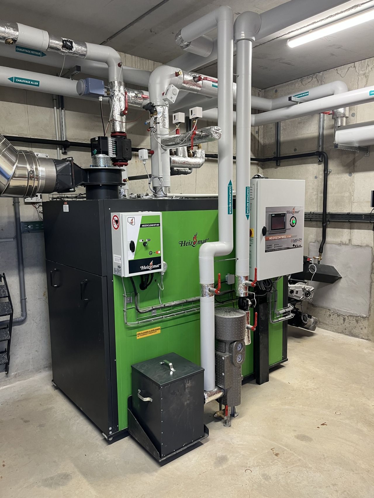 - Chaudière bois de 100 kW alimentée par un silo de plaquettes bois.