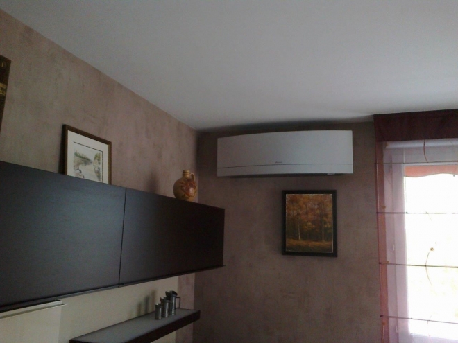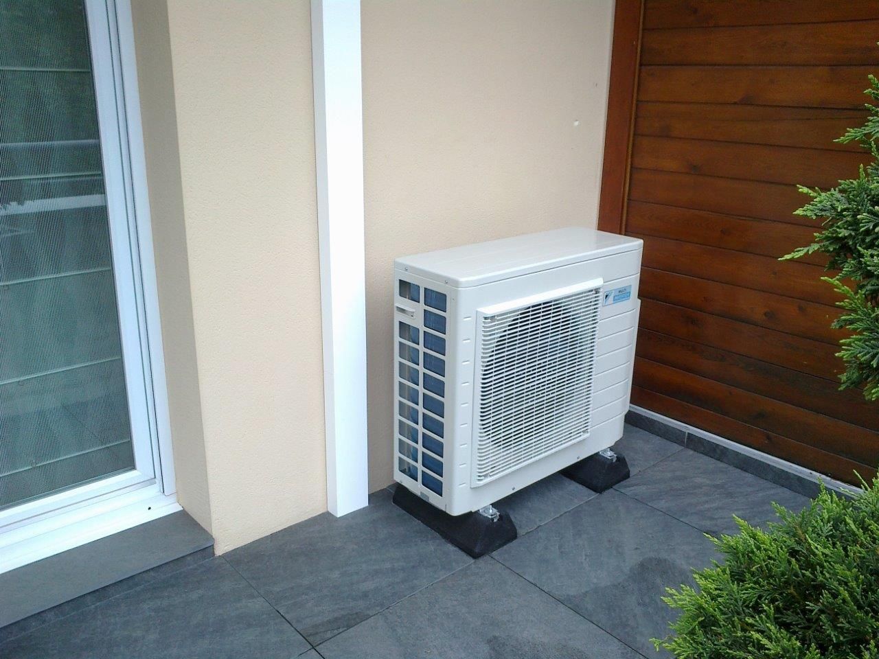 Unités murales de climatisation réversible installées dans un appartement et raccordées à un groupe extérieur Multisplit DAIKIN posé sur consoles antivibratoires sur un balcon.